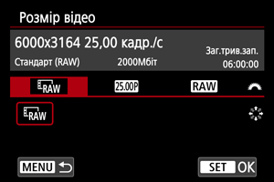 Можна встановити кадрову частоту й тип формату RAW для відеовиходу RAW.