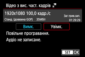 Коли встановлено значення [Увімк.], камера може знімати 239,76/200,00 кадр/с або 119,88/100,00 кадр/с, щоб записувати відеофайли з кадровою частотою 29,97/25,00 кадр/с.