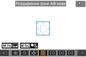 Положення часто використовуваної точки АФ можна зареєструвати. Для перемикання з поточної точки АФ на зареєстровану можна скористатися кнопкою, призначеною для виклику початкового положення, розташованою на екранах додаткових параметрів [Прямий вибір точки АФ], [Старт виміру і АФ], [Перехід на реєстр. точку АФ] або [Зареєстр./викл. функції зйомки] в меню [: Корист. налашт. кнопок зйомки] ().