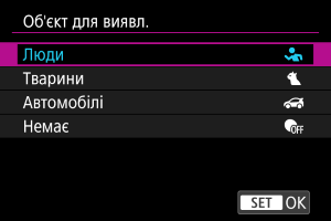 Якщо встановити для параметра [: Виявл. очей] значення, відмінне від [Вимк.] (), можна знімати об’єкт, так щоб його очі були у фокусі.