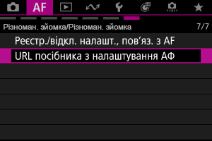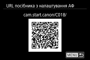 Виберіть [: URL посібника з налаштування АФ] (), щоб відобразити QR-код. Відскануйте QR-код за допомогою смартфона, щоб перейти до посібника з налаштування АФ.