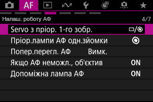 Можна встановити характеристики режиму роботи АФ і час спуску затвора для першого знімка, зробленого з використанням слідкуючого АФ.