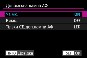 Вимкнення спрацьовування лампи підсвічування АФ. Виберіть це значення, якщо не потрібно вмикати допоміжне підсвічування АФ.