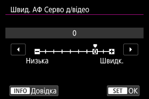 Можна встановити швидкість АФ для слідкуючого автофокусування для відеозйомки. Ця функція доступна, коли для параметра [АФ Серво д/відео] у розділі [: АФ Серво д/відео] встановлено значення [Увімк.] і використовується об’єктив, сумісний з повільним переходом фокуса під час відеозйомки*.
