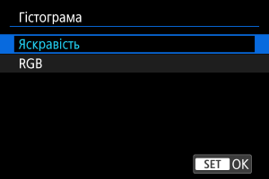 Гістограми показують рівні сигналу в діапазоні тонів. Доступні гістограми яскравості (для перевірки загального рівня експозиції та загальної градації відтінків) і RGB (для перевірки насиченості та тональних переходів червоного, зеленого й синього). Гістограму, що відображається, можна змінити, натиснувши кнопку , коли піктограма [