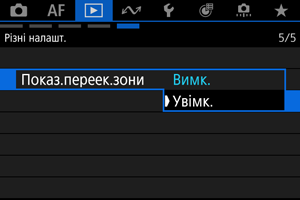Можна вказати, щоб ділянки з надмірною експозицією блимали на екрані відтворення. Щоб отримати детальніші тональні переходи в зонах блимання, де потрібне точне відтворення тональних переходів, установіть від’ємну величину корекції експозиції та повторіть зйомку.