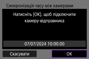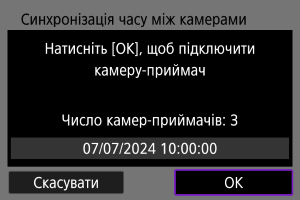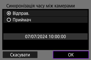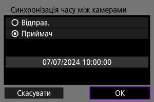 Значення часу камери-відправника можна встановити щонайбільше на 10 камерах-приймачах. Зверніть увагу, що навіть після синхронізації між значенням часу камери-відправника та камери-приймача залишатиметься невелика межа похибки (макс. ±0,05 с).