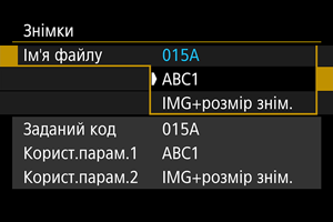 Користувацький параметр 1 дає змогу зареєструвати чотири символи на ваш вибір. Користувацький параметр 2 додає три початкові зареєстровані символи на ваш вибір до четвертого символу, що означає розмір зображення, який автоматично додається після зйомки.