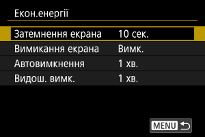 - [Затемнення екрана] і [Вимикання екрана] застосовуються під час відображення екрана зйомки. Ці параметри не застосовуються під час відображення меню або відтворення зображень.