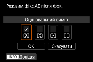 Для кожного режиму виміру можна вказати, чи потрібно фіксувати експозицію (фіксація АЕ) після фокусування на об’єктах зйомки при покадровому автофокусуванні. Експозиція залишається зафіксованою, доки кнопка затвора утримується наполовину натиснутою. Виберіть режими виміру для фіксації AE та додайте позначку []. Виберіть [ОК], щоб зареєструвати параметр.