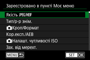 Усі пункти, зареєстровані на вкладках від [MY MENU1] до [MY MENU5], можна видалити. Самі вкладки залишаться. Якщо вибрати [Видалити всі пункти], усі пункти, зареєстровані на створених вкладках, буде видалено.