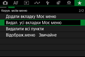 Можна видалити всі створені вами вкладки «Моє меню». Якщо вибрати [Видал. усі вкладки Моє меню], усі вкладки від [MY MENU1] до [MY MENU5] буде видалено та відновлено налаштування вкладки [] за замовчуванням.