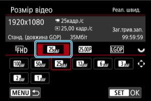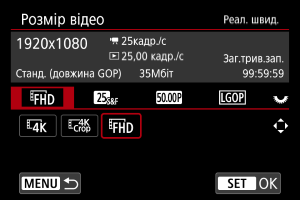 Відео, записані з уповільненням чи прискоренням, відтворюються в уповільненому або прискореному режимі. Звук не записується. Установіть швидкість повільного чи швидкого відтворення в меню [: Розмір відео].