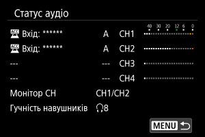 - Параметр [Монітор CH] відображає набір каналів, установлений у меню [Монітор зйомки CH] для параметра [Навушники] у розділі [