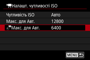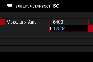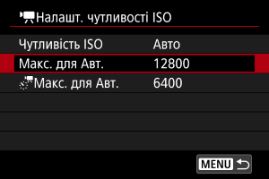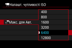 ] з автоматичним вибором чутливості ISO можна налаштувати максимальне обмеження діапазону автоматичного вибору чутливості ISO для записування покадрового відео у форматі 4K або Full HD.