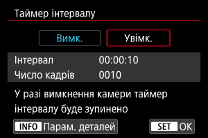 - Щоб припинити зйомку з таймером інтервалу, виберіть [Вимк.] або встановіть перемикач живлення в положення
