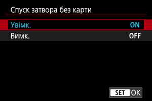 Щоб не можна було виконувати зйомку, коли в камері немає карти пам’яті, установіть для цього параметра значення [Вимк.].