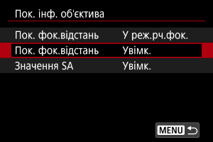 Під час використання об’єктивів RF може відображатися відстань фокусування. Для відображення відстані фокусування можна вибрати час та одиницю вимірювання.