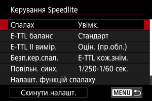 - Скидання параметрів функцій спалаху/Скидання всіх користувацьких функцій Speedlite