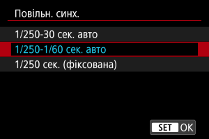 Можна встановити витримку синхронізації спалаху для зйомки зі спалахом у режимі [P] або [Av]. Зауважте, що мінімальне значення витримки синхронізації спалаху становить 1/250 с.