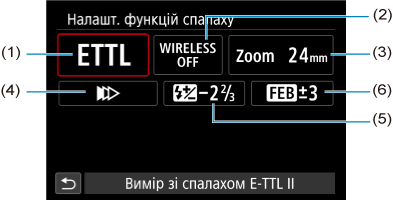 Інформація, що відображається на екрані, розташування індикаторів і доступні параметри залежать від моделі зовнішнього спалаху Speedlite, налаштувань його користувацьких функцій, режиму спалаху й інших факторів. Докладніше про функції спалаху Speedlite див. в інструкції з використання спалаху Speedlite.