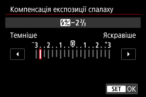 - Якщо значення компенсації експозиції для зйомки зі спалахом задано за допомогою спалаху Speedlite, змінити його за допомогою камери неможливо. Якщо його встановлено і на камері, і на спалаху Speedlite, діятиме налаштування спалаху Speedlite.