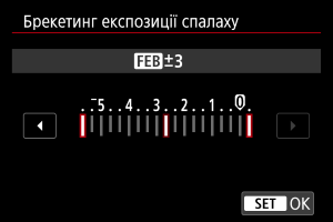 Для спалахів Speedlite з функцією брекетингу експозиції спалаху (FEB) потужність спалаху може змінюватись автоматично в процесі зйомки трьох послідовних кадрів.