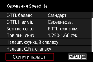 Скидання параметрів функцій спалаху/Скидання всіх користувацьких функцій Speedlite