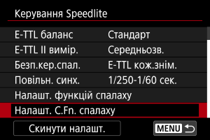 - Виберіть [Скинути налашт. спалаху] або [Стерти всі C.Fn Speedlite].
