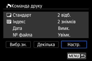 Спосіб друку Стандарт Друк по одному зображенню на аркуші. Індекс На одному аркуші буде надруковано кілька ескізів зображень. Обидва Друк стандартного та індексного зображення. Дата Увімк. [Увімк.] означає друк дати зйомки зображення. Вимк. № файла Увімк. [Увімк.] означає друк номера файлу. Вимк. -