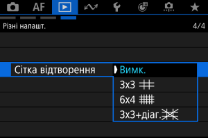 На екрані під час відтворення зображень поодинці на фотографіях можна відобразити сітку. Ця функція стане в пригоді, коли потрібно перевірити композиції та нахил зображення за вертикаллю або горизонталлю.