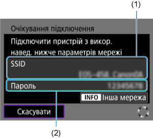 - Перегляньте SSID (1) і Пароль (2), що відображаються на екрані камери.