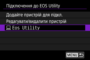 У службовій програмі EOS Utility клацніть [Pairing over Wi-Fi/LAN/Створення пари через Wi-Fi/локальну мережу].