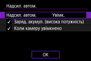 - [Заряд. акумул. (висока потужність)]. Автоматичне надсилання починається, коли камеру вимкнено й підключено до джерела живлення для заряджання через USB. Зауважте, що автоматичне надсилання почнеться після того, як камера трохи зарядиться, якщо залишковий рівень заряду акумулятора був низьким.