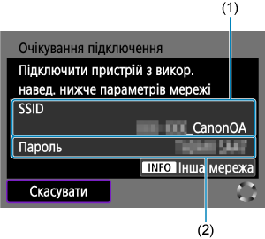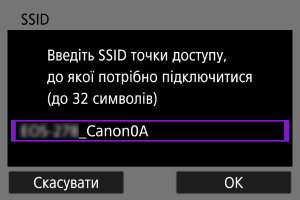 Налаштування параметрів мережі для режиму точки доступу камери виконується вручну. Введіть [SSID], [Вибір каналу] та [Параметри шифрування] на кожному екрані, що відображаються.