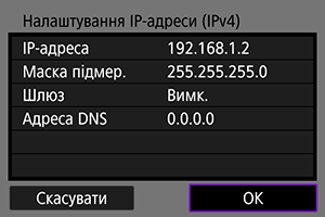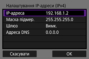 Установіть параметри IP-адреси вручну. Зверніть увагу, що відображені елементи різняться залежно від функції зв’язку.