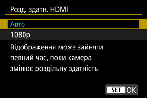 Установіть вихідну роздільну здатність зображення, яка використовується за підключення камери до телевізора або зовнішнього пристрою записування через HDMI-кабель.