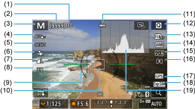 - (2) Кількість доступних знімків / кількість секунд до спрацьовування таймера автоспуску