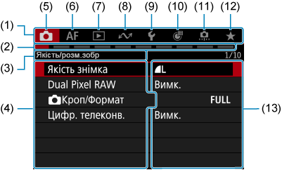 - (13) Налаштування меню