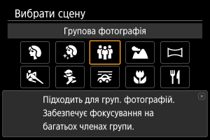 Використовуйте режим [] (Групова фотографія) для зйомки групових фотографій. Ви можете знімати людей на передньому та задньому плані таким чином, щоб вони всі були у фокусі.