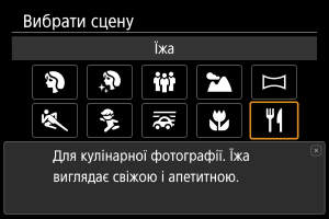Використовуйте режим [] (Їжа) для кулінарної фотозйомки. Зображення виглядатиме яскраво та апетитно. Також у ньому зменшується червонуватий відтінок, створюваний лампами розжарювання й подібними джерелами світла.