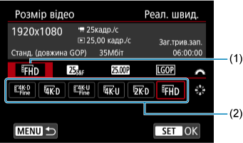 Можна записувати відео для повільного або швидкого відтворення. Звук не записується. Установіть швидкість повільного чи швидкого відтворення в меню [: Розмір відео].