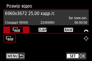 Можна встановити кадрову частоту й тип формату RAW для відеовиходу RAW.