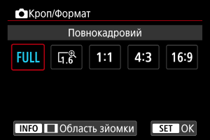 Якщо використовується об’єктив RF або EF, можна змінити формат знімків перед зйомкою. Можна використовувати варіант [1,6x (кроп-фактор)], щоб знімати з ефектом телеоб’єктива, оскільки він збільшує центральну частину зображення (область, еквівалентна формату APS-C).