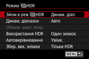 Якщо вибрати [Один знімок], режим HDR автоматично скасовується після завершення зйомки.