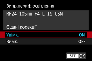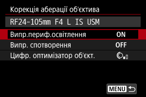 - Якщо використовується об’єктив іншого виробника (не Canon), для функцій корекції рекомендується встановлювати значення [Вимк.], навіть коли відображається повідомлення [Є дані корекції].