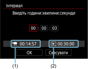 Вказує час, потрібний для зйомки заданої кількості кадрів з установленим інтервалом. Якщо значення перевищує 24 години, буде відображено «*** днів».