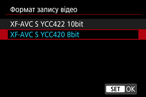 Буде відображено доступні значення розміру відео (комбінації роздільної здатності, кадрової частоти та стиснення).
