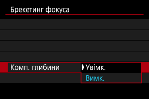 - Виберіть [Вимк.], якщо не бажаєте коригувати зміни яскравості зображення під час брекетингу фокуса. Використовуйте цей параметр для цілей, відмінних від компонування глибини знятих зображень у програмі Digital Photo Professional ().