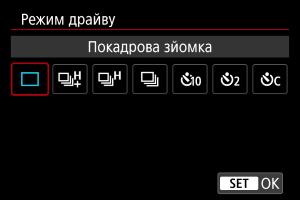 Можна вибрати один з режимів спрацьовування затвора з меню. Докладніше дивіться в розділі «Вибір режиму спрацьовування затвора» ().